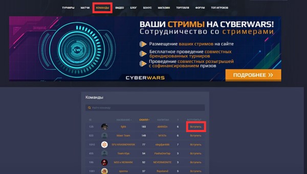 После входа в аккаунт выберете вкладку "Команды" в верхнем меню сайта. Здесь находятся все команды платформы CyberWars с описанием.